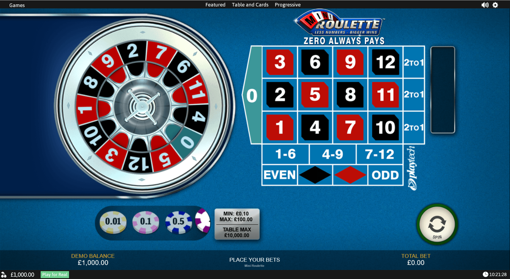Zugleich bietet sich Mini Roulette für Menschen an, die weniger wagemutig sind. Durch die höheren Gewinnchancen und geringere Verluste ; wenn die Null erscheint, ist es weniger wahrscheinlich, seinen Einsatz zu verlieren. Der Hausvorteil wird durch die halbe Rückzahlung der Null auf 3,85 Prozent gesenkt.